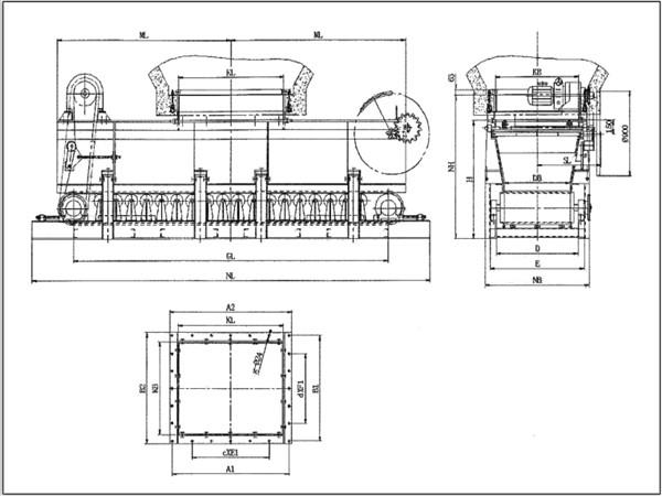 雙向帶式(甲帶)給料機(jī)在訂貨時(shí)須給出從料倉(cāng)口中心到卸料口的距離以及給料量和電壓等級(jí)等參數(shù),以便進(jìn)行制作。雙向帶式(甲帶)給料機(jī)有兩個(gè)出料口,為了實(shí)現(xiàn)物料向兩個(gè)方向移動(dòng)并適用于一個(gè)料倉(cāng),在不同時(shí)間分別向兩個(gè)承接裝置給料的工況,采用的驅(qū)動(dòng)裝置的正反轉(zhuǎn)可以帶動(dòng)甲帶的正反轉(zhuǎn)。