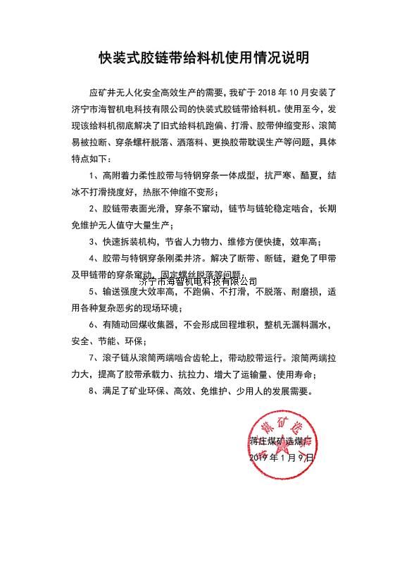 快裝式膠鏈帶給料機可實現完美替代物料運輸系統在用的所有形式的給料機,包括甲帶給料機、帶式給料機、振動給料機、往復式給料機、鏈板給料機等,膠鏈帶給料機更好的解決了跑偏、打滑、換裝困難等問題,更利于實現快速裝車、高效自動化的現代智能運輸系統要求。